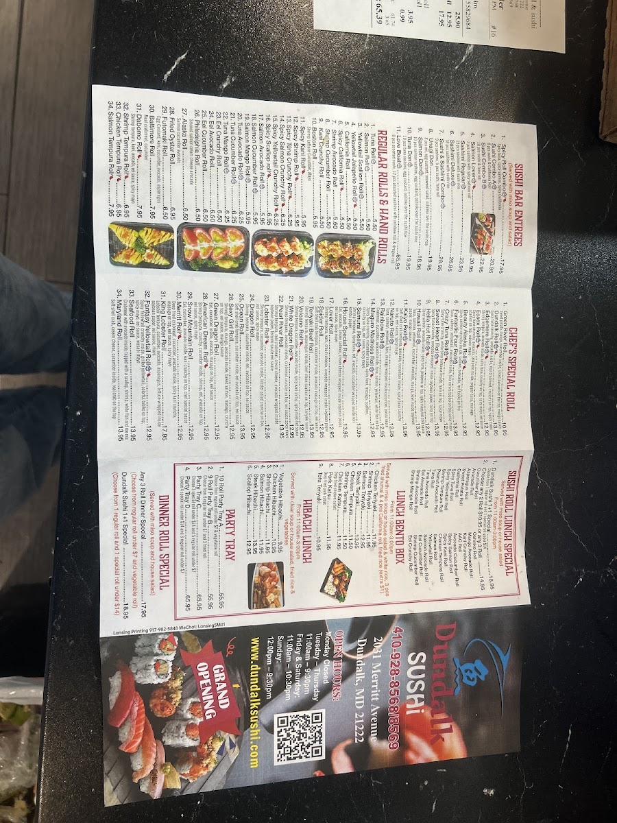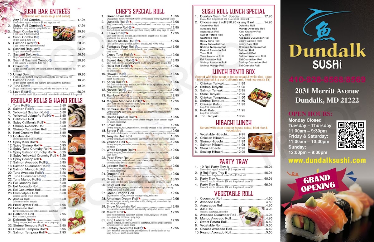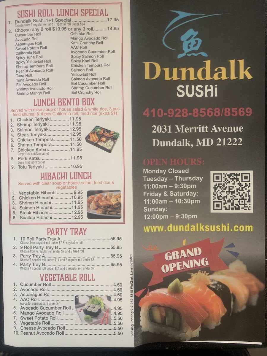 The menu at Dundalk Seafood & Sushi offers a wide variety of delicious options, perfect for sushi lovers and those seeking hibachi-style meals. For appetizers, they have unique choices like the Fried Kani Boat and Sushi Sandwich, along with the flavorful Salmon BallCrunchy Avocado. The hibachi section features options such as the Hibachi Steak & Salmon and Hibachi Chicken & Scallop. If you're in the mood for something lighter, you can enjoy sides like Hibachi Fried Rice or Sushi Rice, as well as soups like Miso Mushroom Soup and Vegetable Tofu Soup. The sushi rolls are plentiful, with favorites like the Spicy California Roll and Spicy Tuna Crunchy Roll, alongside more unique rolls like the Monster Roll and 007 Roll. For those looking to build a meal, the Bento options are a great choice, including Shrimp Teriyaki Bento and Pork Katsu Bento. Don’t miss the chef’s special rolls, such as the Hella Hot Roll and Volcano Roll, as well as refreshing Poke Bowls like the Steak Poke Bowl. For dessert, try the indulgent Fried Cheese Cake or classic Cheese Cake. Whether you’re enjoying a sushi bar entrée like the Tuna Don or opting for a party tray, Dundalk Seafood & Sushi’s diverse menu has something to satisfy every craving.