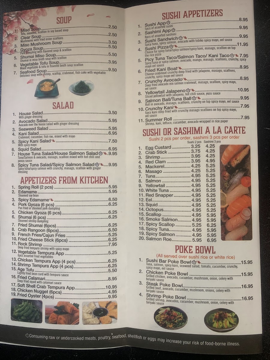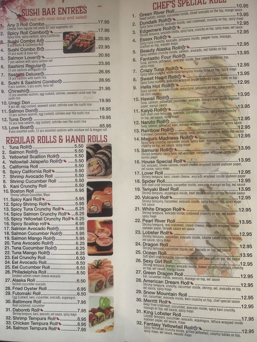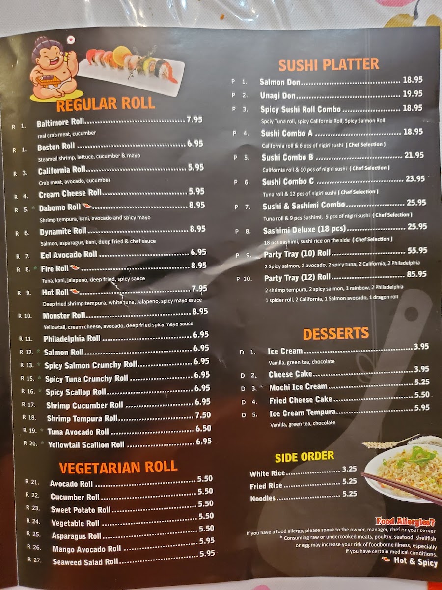 The menu at Dundalk Seafood & Sushi offers a wide variety of delicious options, perfect for sushi lovers and those seeking hibachi-style meals. For appetizers, they have unique choices like the Fried Kani Boat and Sushi Sandwich, along with the flavorful Salmon BallCrunchy Avocado. The hibachi section features options such as the Hibachi Steak & Salmon and Hibachi Chicken & Scallop. If you're in the mood for something lighter, you can enjoy sides like Hibachi Fried Rice or Sushi Rice, as well as soups like Miso Mushroom Soup and Vegetable Tofu Soup. The sushi rolls are plentiful, with favorites like the Spicy California Roll and Spicy Tuna Crunchy Roll, alongside more unique rolls like the Monster Roll and 007 Roll. For those looking to build a meal, the Bento options are a great choice, including Shrimp Teriyaki Bento and Pork Katsu Bento. Don’t miss the chef’s special rolls, such as the Hella Hot Roll and Volcano Roll, as well as refreshing Poke Bowls like the Steak Poke Bowl. For dessert, try the indulgent Fried Cheese Cake or classic Cheese Cake. Whether you’re enjoying a sushi bar entrée like the Tuna Don or opting for a party tray, Dundalk Seafood & Sushi’s diverse menu has something to satisfy every craving.