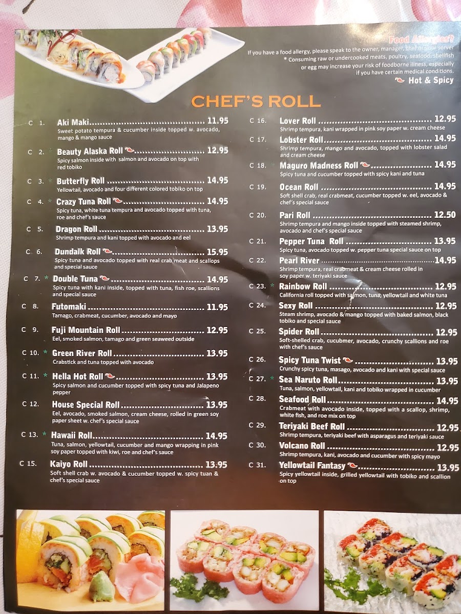 Spicy tuna roll, spicy California roll, spicy salmon roll.